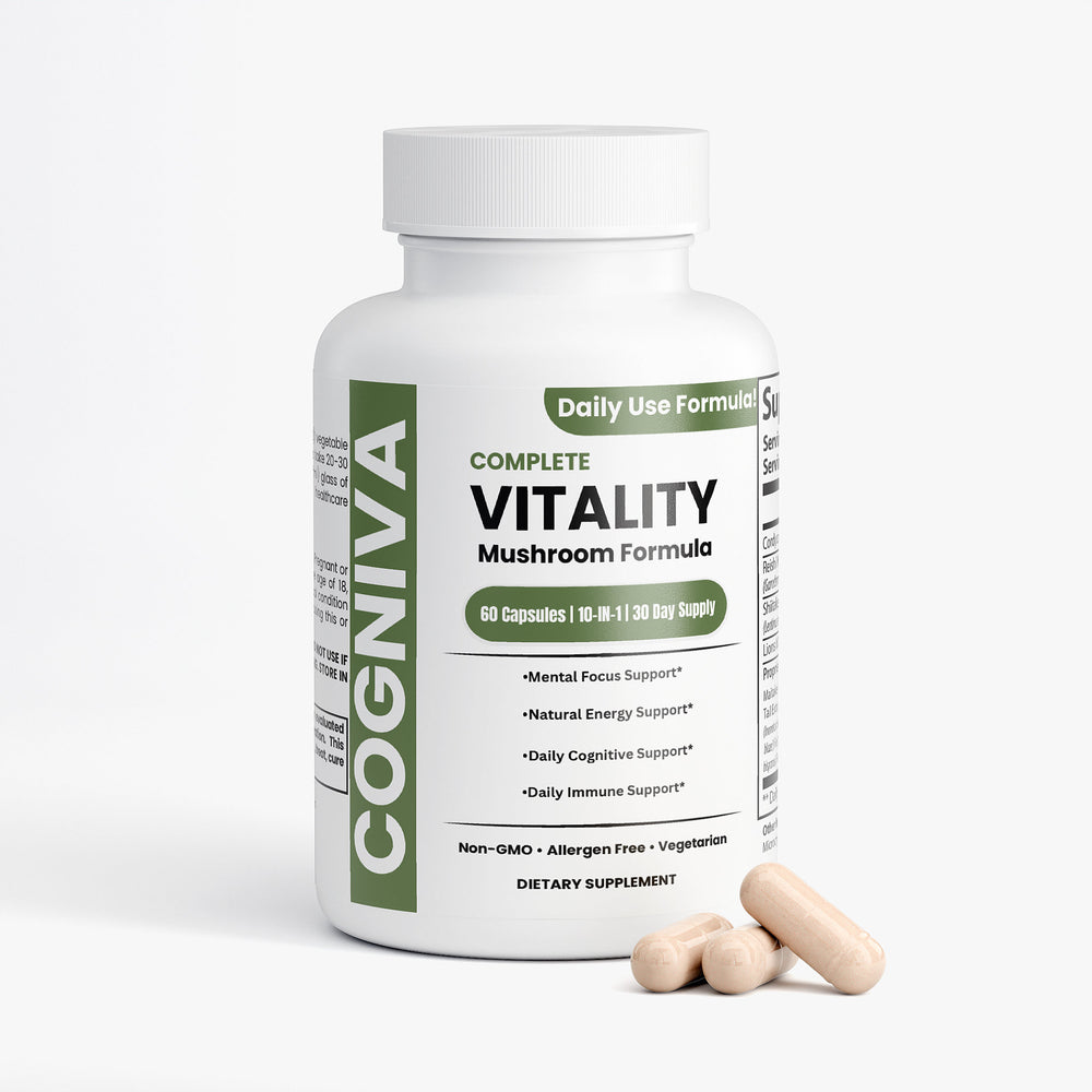 Vitality 10X Mushroom is made with a potent blend of medicinal mushrooms known for their health benefits. It features Chaga, Cordyceps, Reishi, Lion's Mane, and others, helping to boost brain function and support immune health, making it a fantastic addition to any wellness routine.
